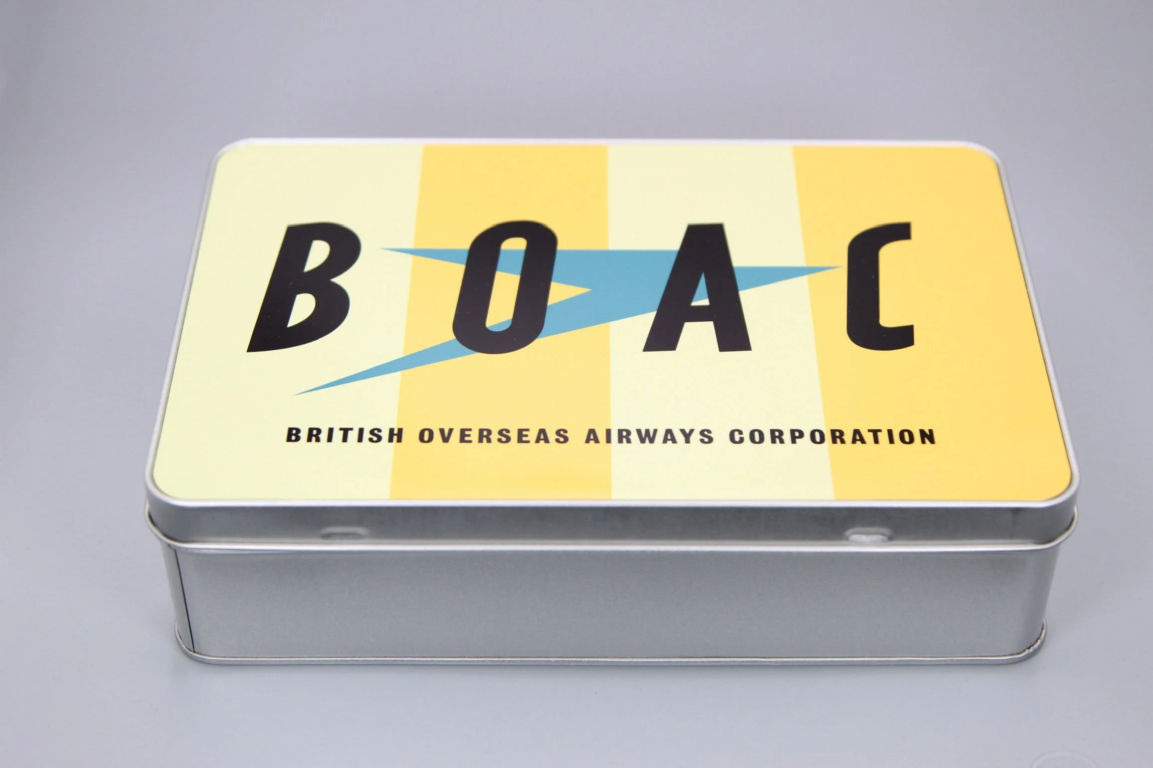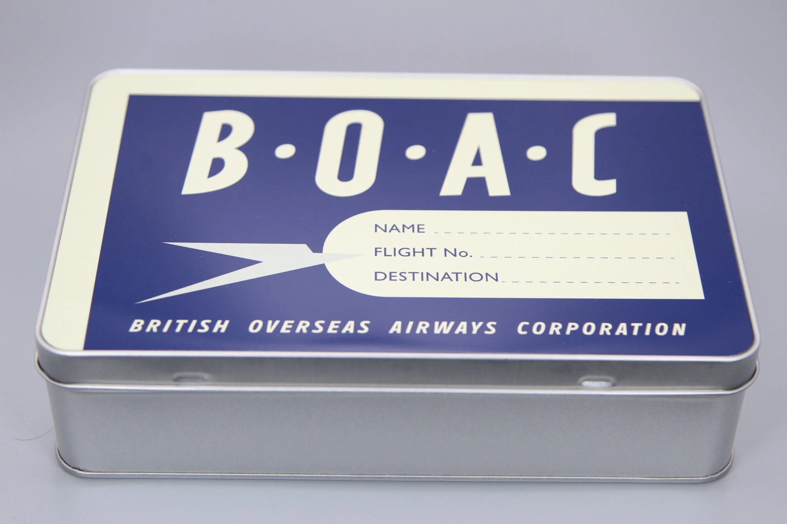 We’ve redrawn a BOAC VC-10 luggage tag, given it a tweak to fit the lid of this tin and popped five packs of 2 Borders biscuits inside. So once the biccies have been demolished, the tin can be used for storing items that are currently gathering dust.